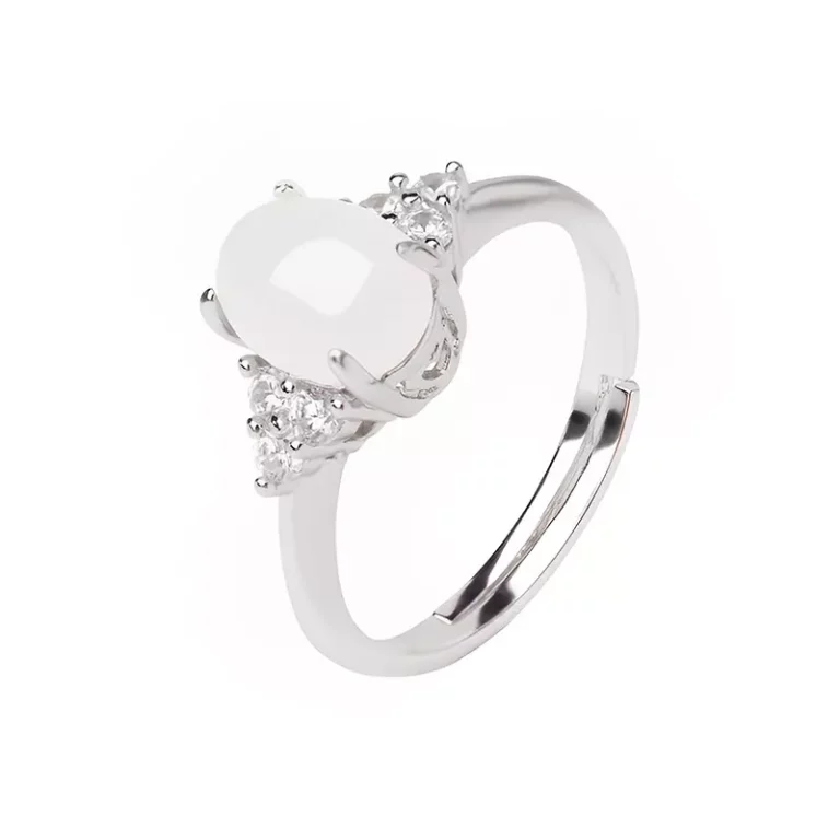 ID:10010521084 Jade size: 6*8mm Weight: 2.16g Ring size: Adjustable Colour: white gold Material: S925 silver + natural Hetian jade