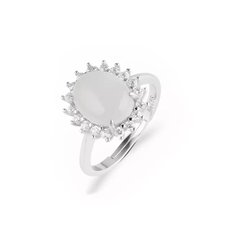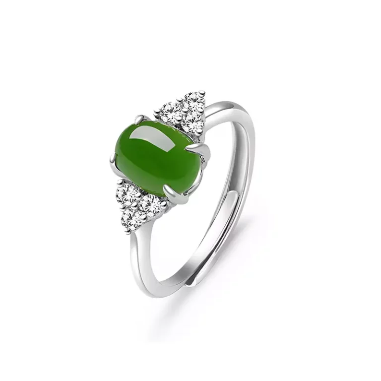 ID:10010721082 Jade size: 6*8mm Weight: 1.92g Ring size: Adjustable Colour: white gold Material: S925 silver + natural Hetian jade Craftsmanship: 18 real…