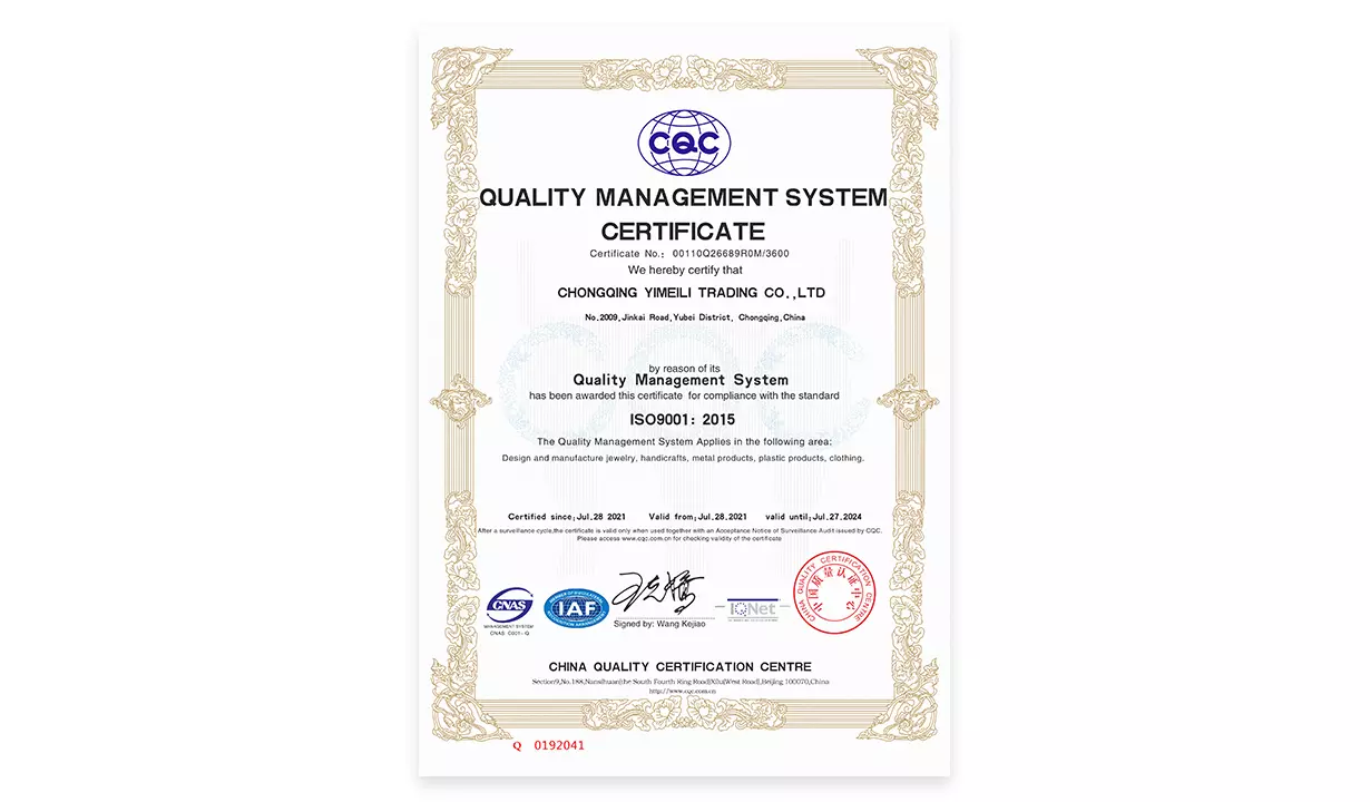 YIMEILI focuses on transparency and certification. They provide information about the origin and supply chain of their products so that consumers can understand the back story of their products. In addition, the jewelry brand has obtained relevant certifications such as CQC, ISO9001 certification.